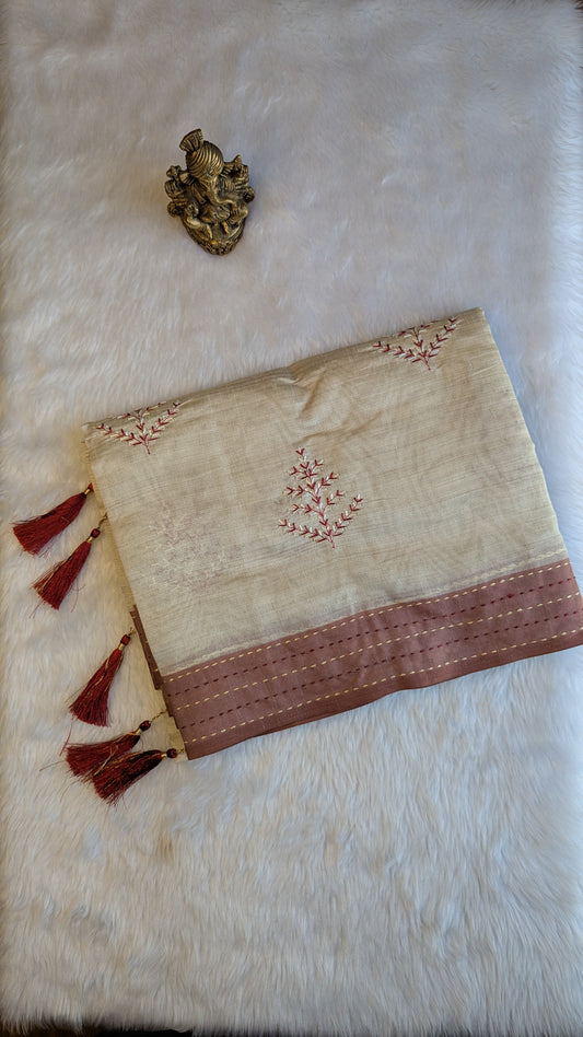 Cream and Brown Cotton mix Tussar silk with Embroidery