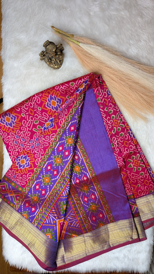 Pink and Ajrakh Border Satin Crepe Silk Saree