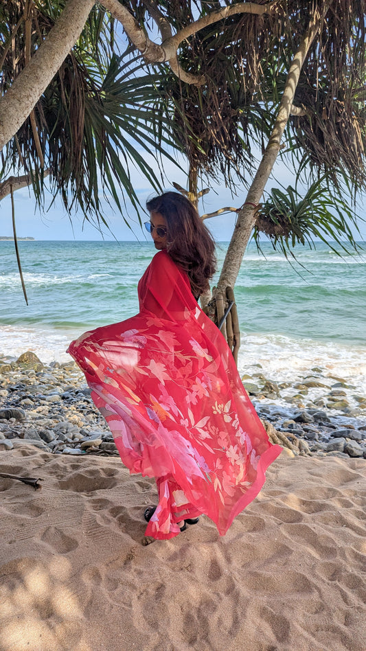 Orangish Red Viscose Crepe Silk with Flower Zari Border