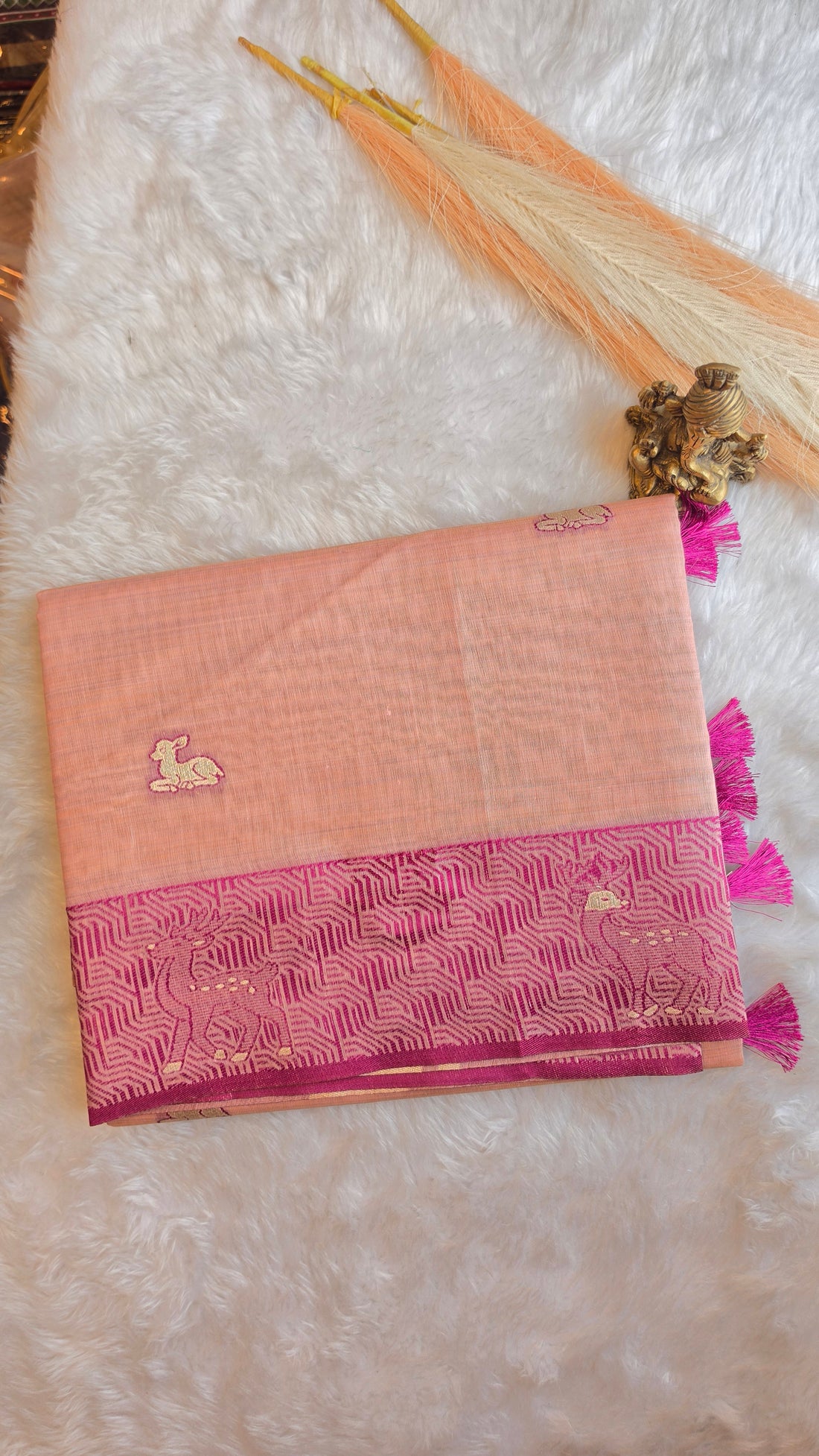 Fabric: Soft Silk/ Printed Silk Color: Light Peach color body and Peach color Border Print/...