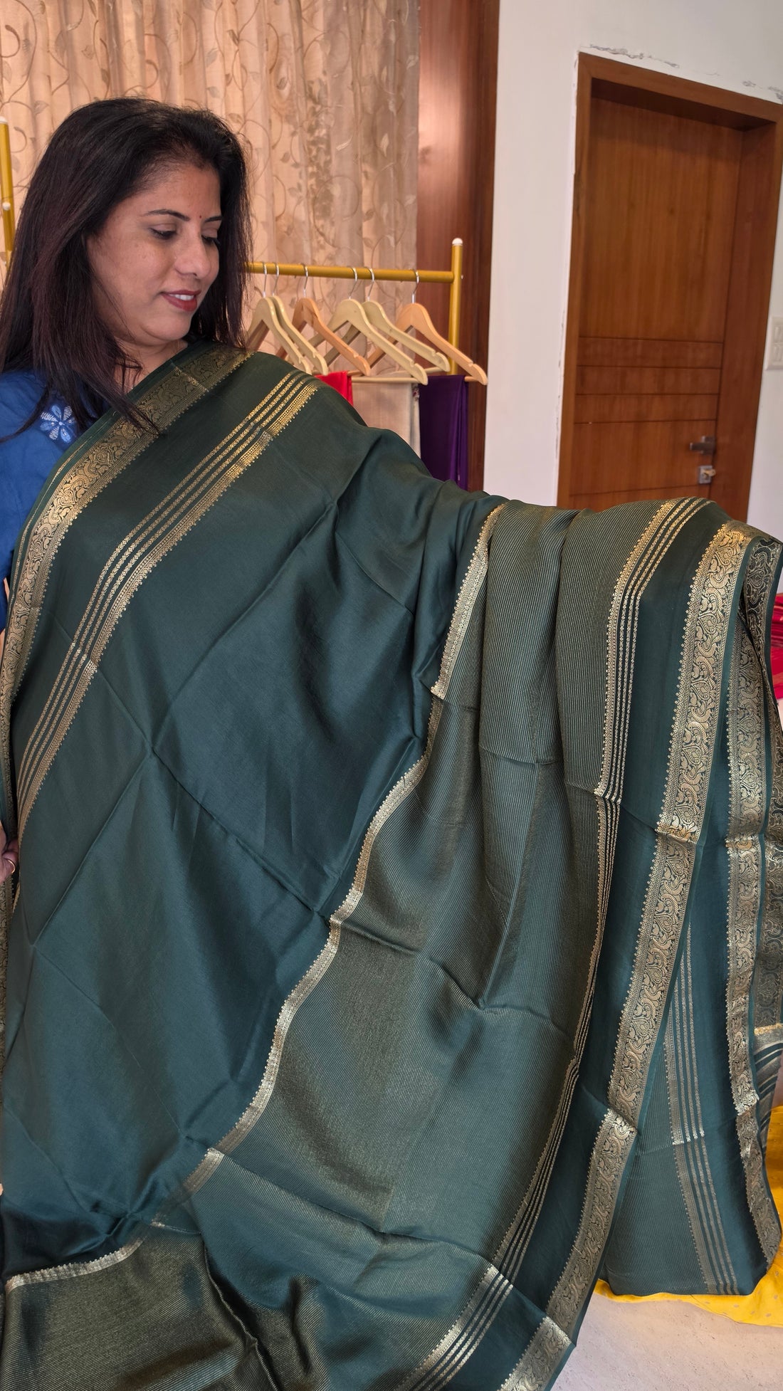 Fabric: Premium Semi Mysore Silk Color: Bottle Green Print/ Design: Gap Border with Gandaberunda border....