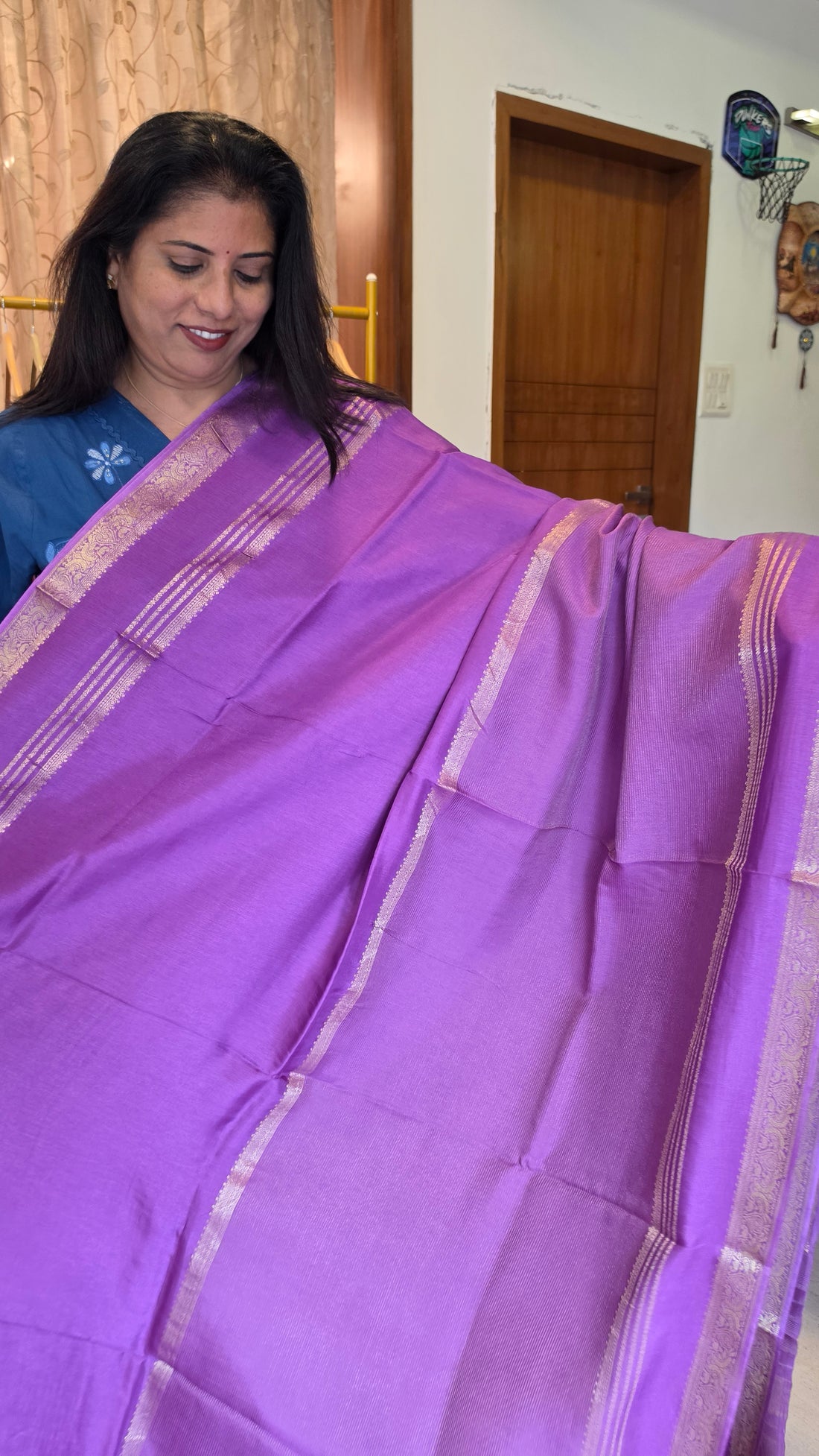 Fabric: Banarasi Silk Color: Purple and Cream Border Print/ Design: Zari Butta all over the...