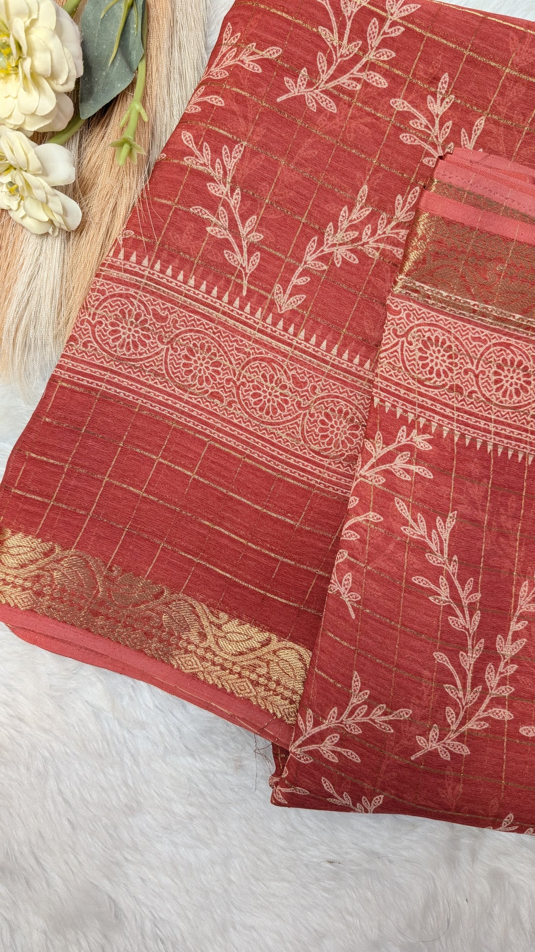 Fabric: Soft Fabric, Chiffon Color: Rust Orange Print/ Design: Zari border and flower prints Saree...