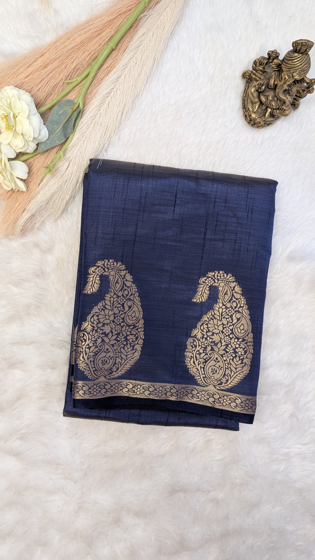 Fabric: Semi Tussar Silk Color: Navy Blue Print/ Design: Plain Saree , Small upper boarder and...