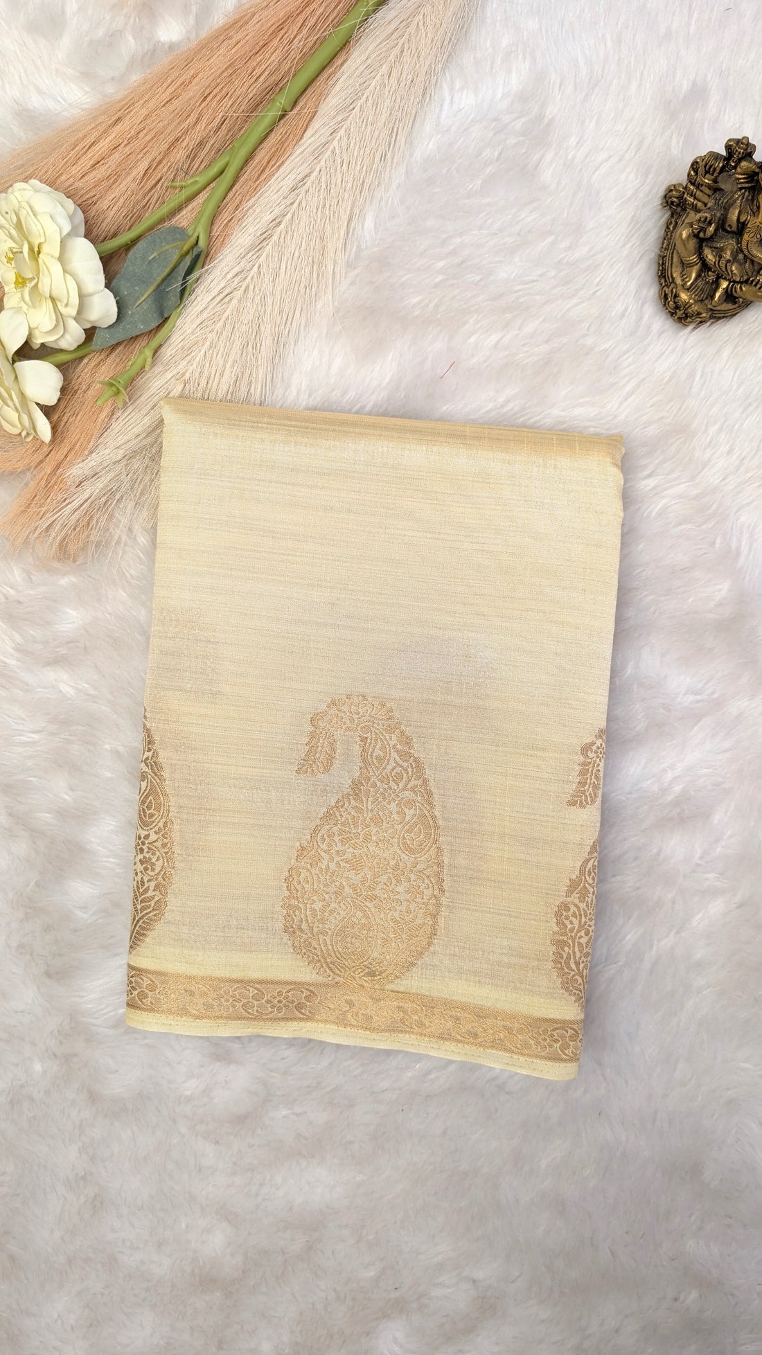 Fabric: Cotton Color: Cream and Green Print/ Design: Flower weaving design saree and Pallu Saree...