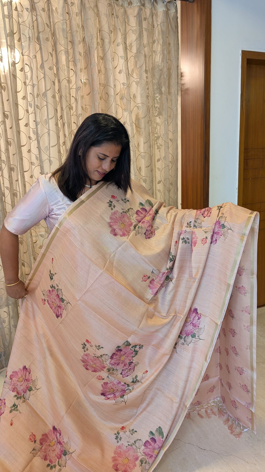 Fabric: Tussar Silk Color: Peach color Print/ Design: Pink and Floral Print with designer Pallu...