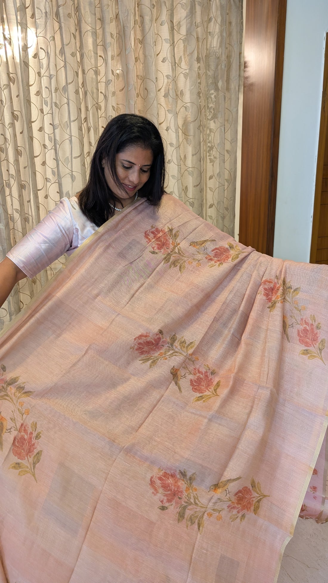 Fabric: Tissue Tussar Silk Color: Peach color Print/ Design: Pink and Floral Print with designer...