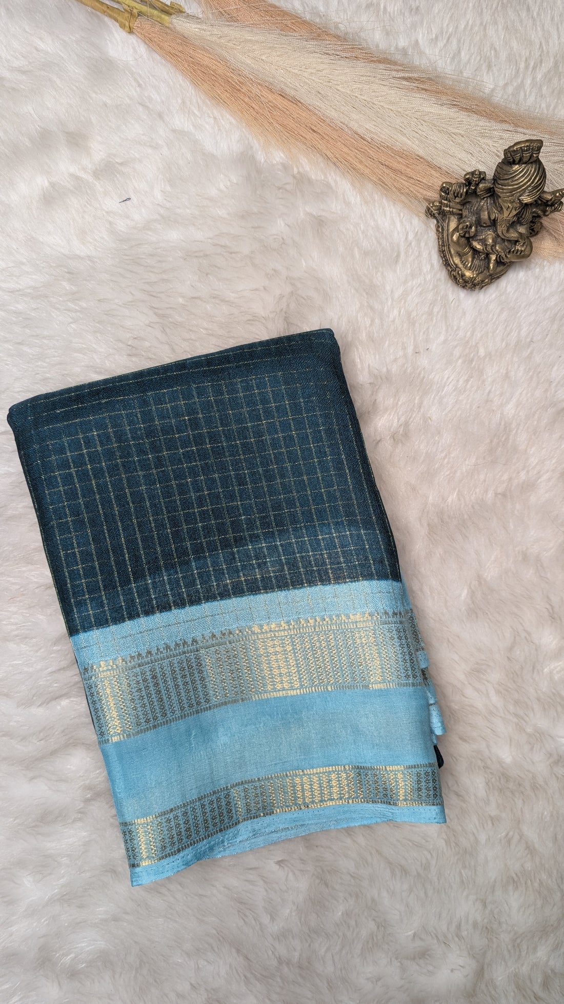 Saree: Small Checks with Contrast Border Color: Bluish Green and Light Blue Blouse: Border Color...