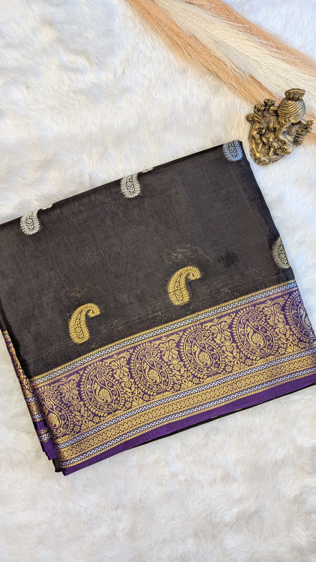 Fabric: Banarasi Pure Silk Color: Grey and Purple Border Print/ Design: Zari Butta all over...