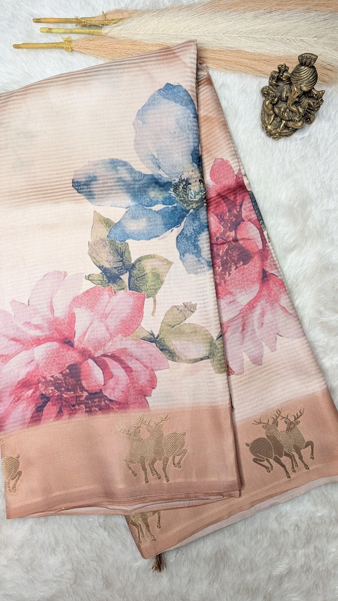 Fabric: Super soft Silk Color: Peach Print/ Design: Saree fabric is super soft, Floral prints...