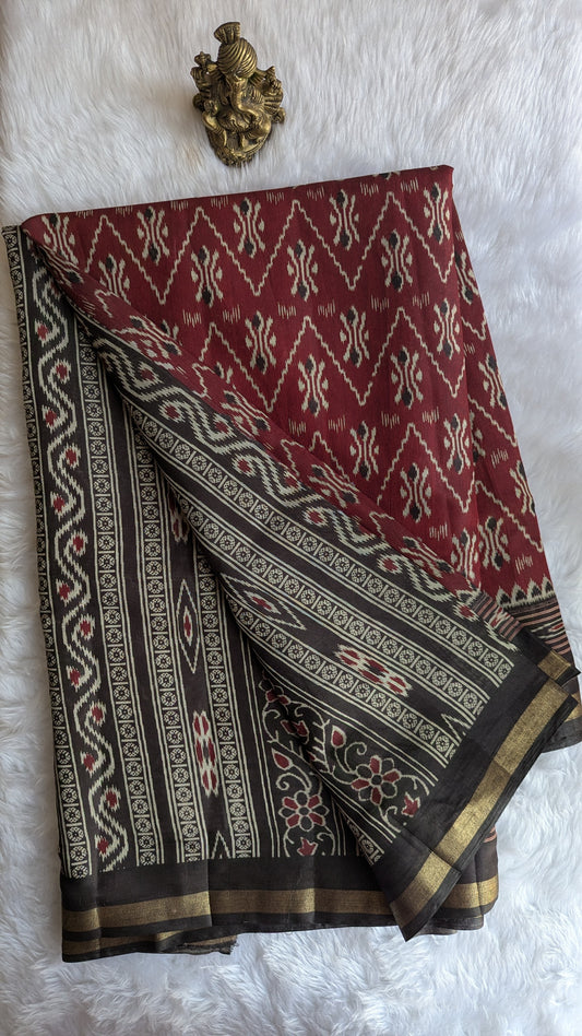 Maroon Red and Ajrakh Border Sateen Silk Saree