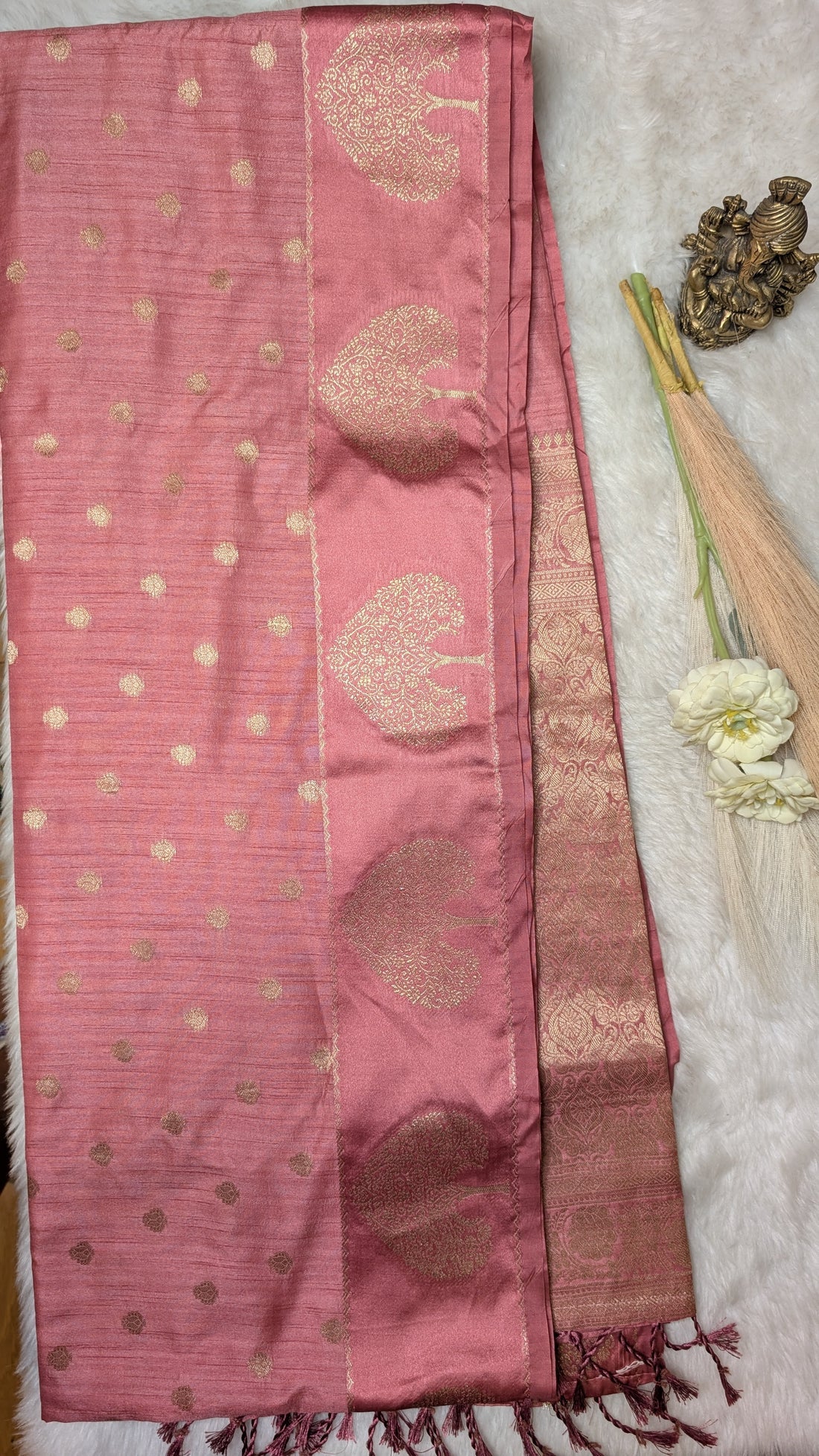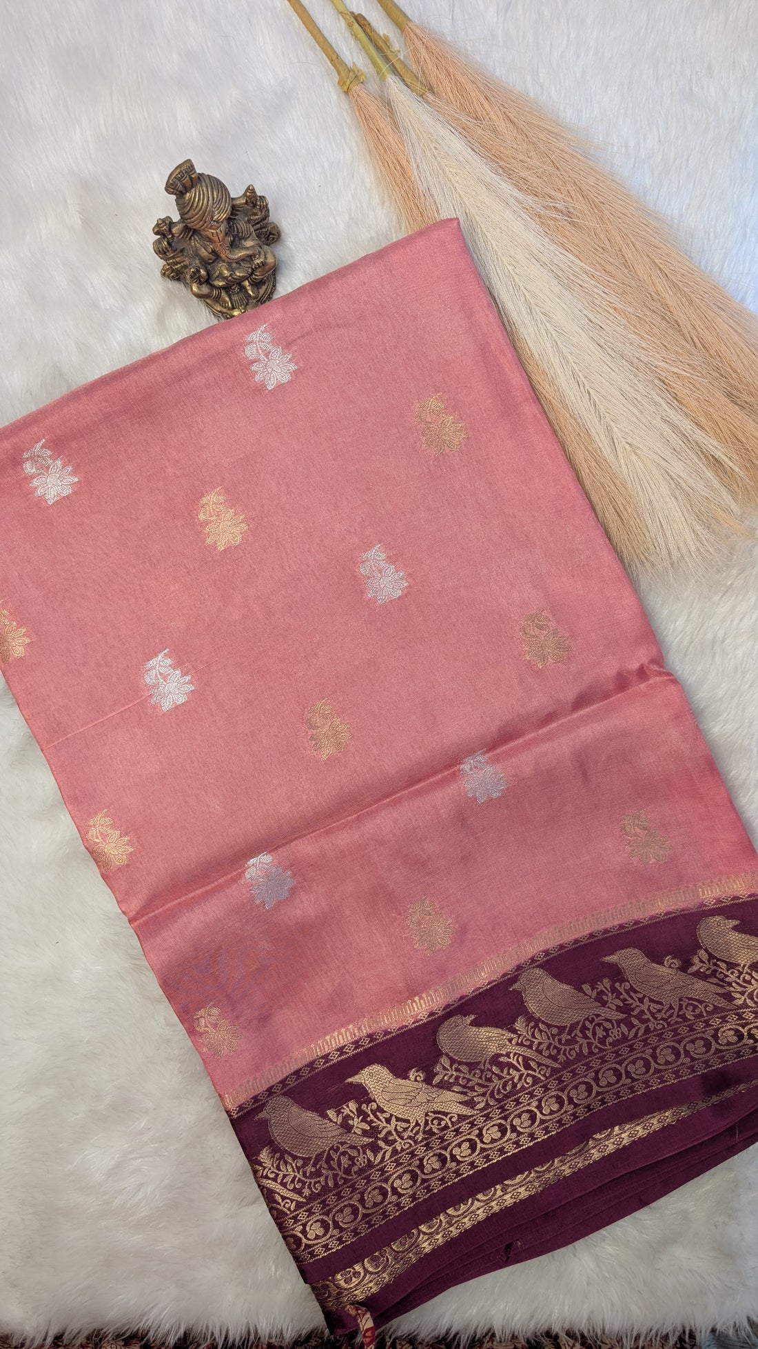 Fabric: Viscose Silk Color:Pink and Maroon Border Print/ Design: Gold and Silver Zari buttas with...