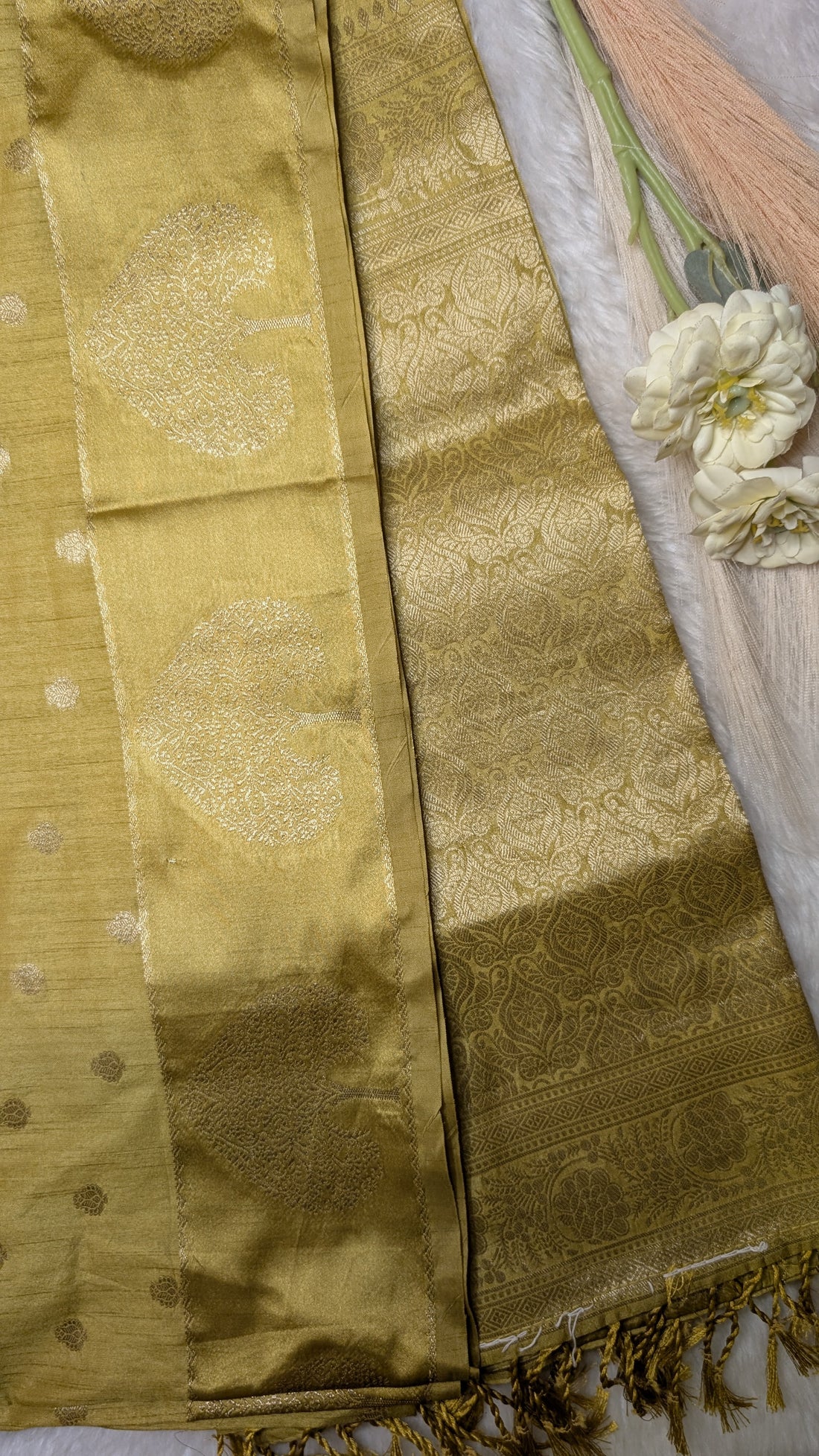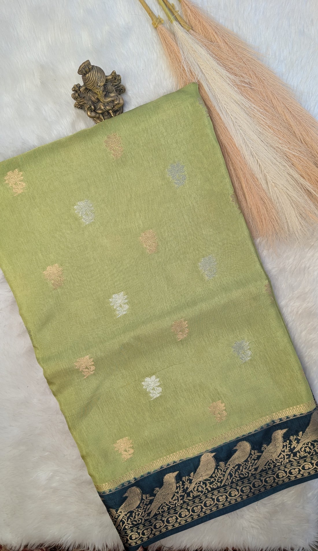 Fabric: Tussar Silk Color: Mehendi Green Print/ Design: Satin border ( Raw Mango silk Patern) ,...