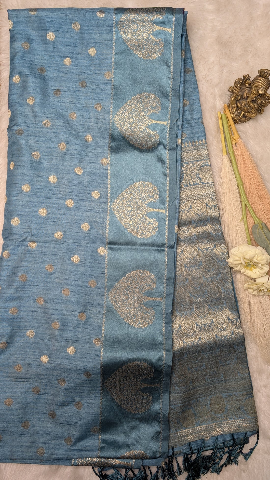 Fabric: Tussar Silk Color: Greyish Blue Print/ Design: Satin border ( Raw Mango silk Patern) ,...