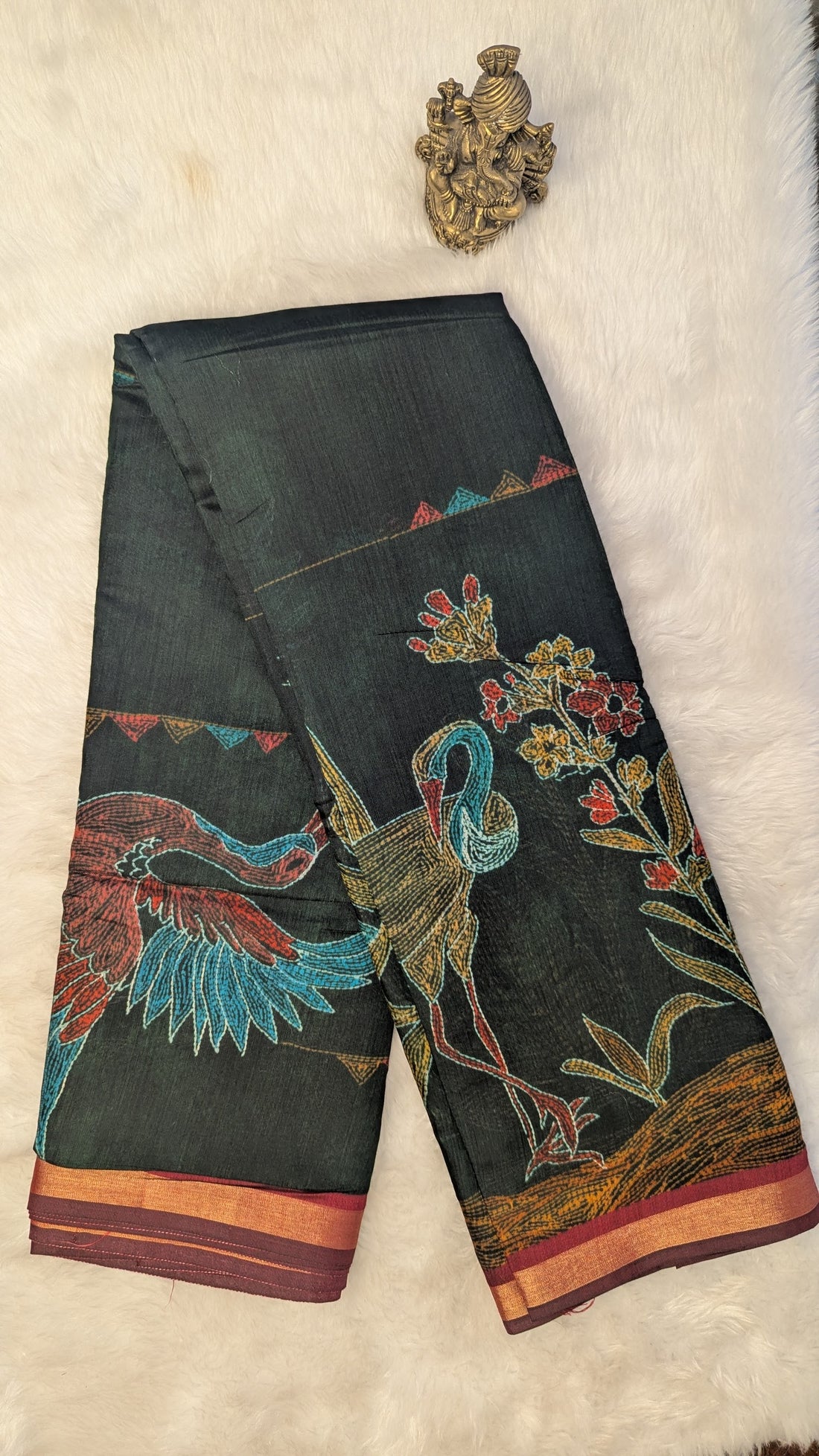 Fabric: Chanderi Cotton Color: Dark Green Print/ Design: Kalamkari Inspired Printed Motif Saree Length: 5.5 meters...