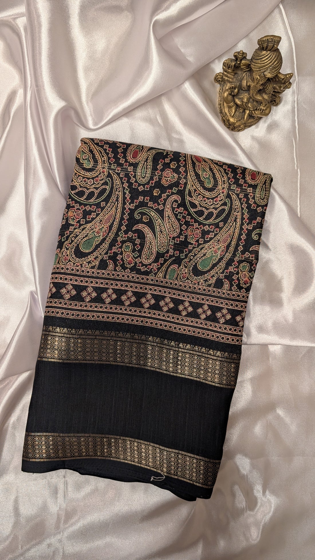 Fabric: Soft Color: Black & Golden Print/ Design: Paisley Prints Saree Length: 5.5 meters (approx.) Blouse...