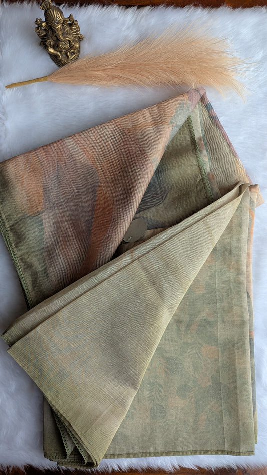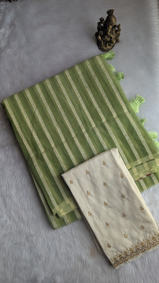 Cream and Green Cotton mix Tussar silk with Embroidery