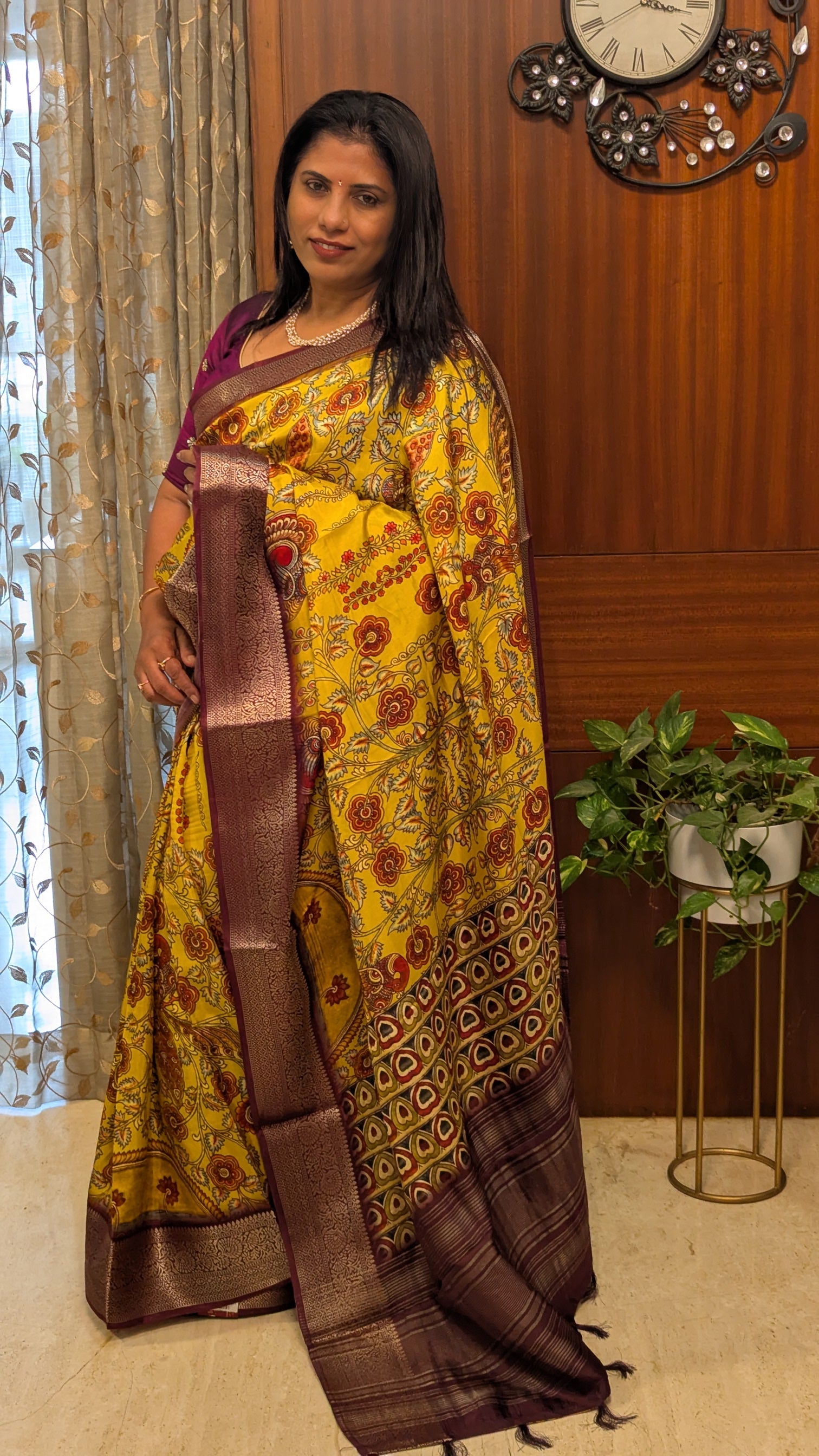 Yellow and Purple Printed Silk Saree